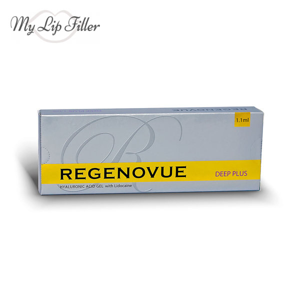 Regenovue Deep Plus is the lidocaine containing counterpart of the based Deep dermal filler from Regenovue. In their properties and application both products are nearly identical – soft filler for lip augmentation and removal of moderate skin lines, wrinkles and depressions. Either can be very useful in filling glabellar lines between the eyebrows or to hide not-too-severe marionette lines on either sides of the mouth.